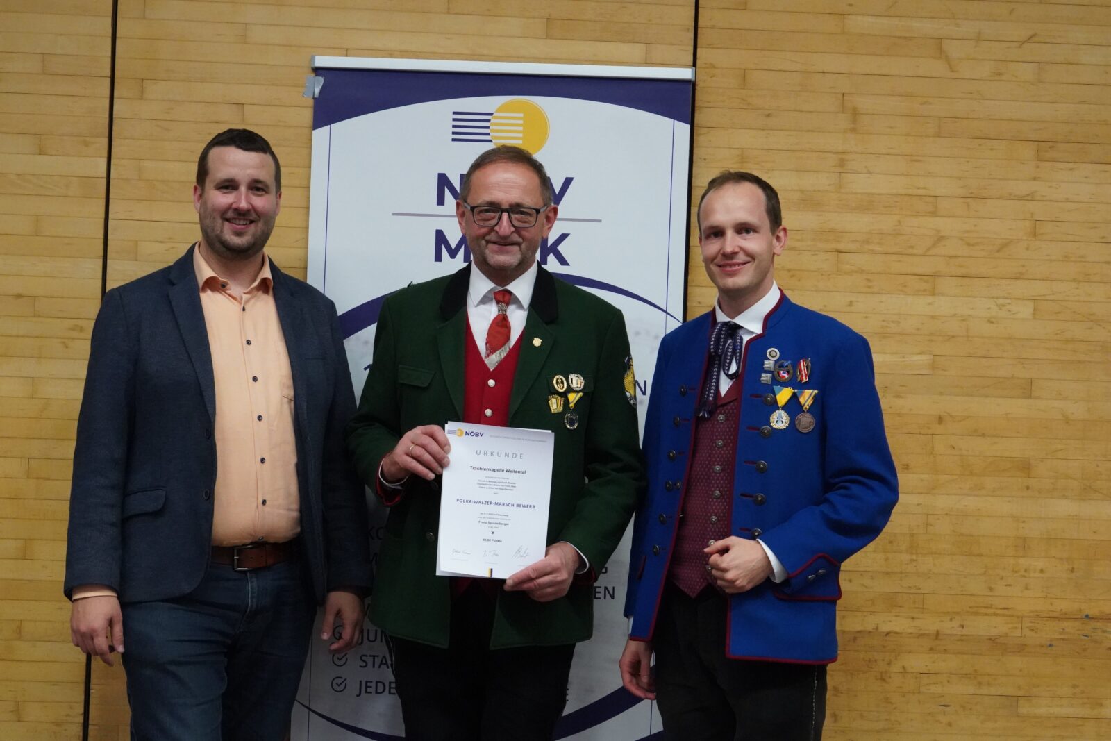 Ganz besonders freute uns, dass unser Kapellmeister Franz Spindelberger die Dirigentennadel in Gold bekommen hat. Er führte uns durch 9 erfolgreiche Konzertbewertungen. Überreicht bekam er dies von Landesobmann Stv. Gerhard Schnabel und Bezirkskapellmeister Reinhard Stöger.
